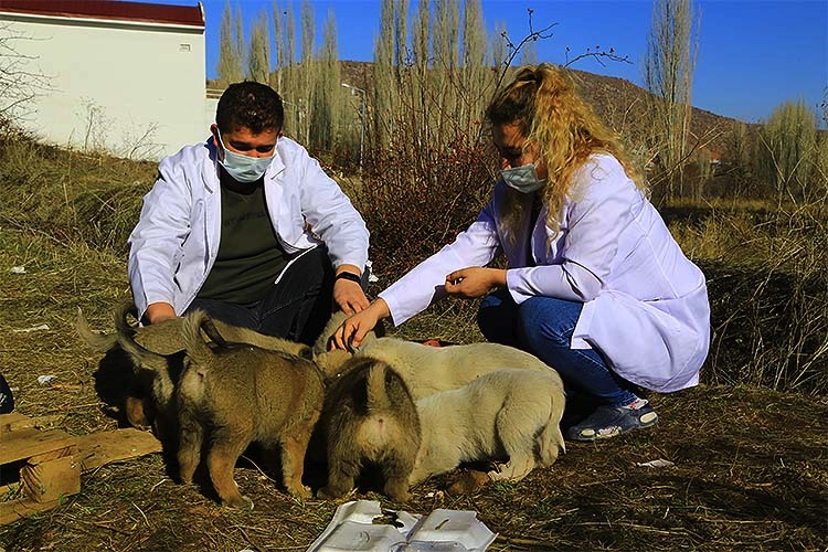 Konya'nın Hadim ilçesindeki devlet hastanesinde görevli sağlık çalışanları, bir yandan yeni tip koronavirüs ile mücadeleyi sürdürürken, diğer yandan hastane bahçesinde doğum yapan engelli köpek ve 11 yavrusuna sahip çıktı.