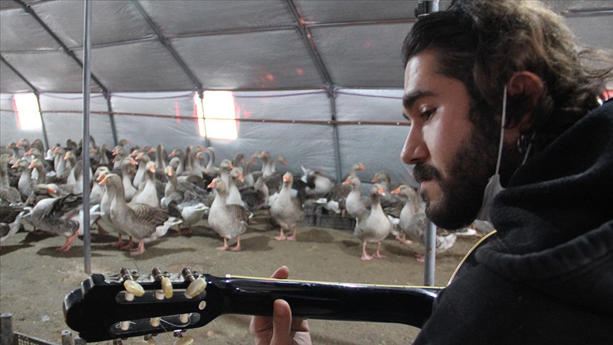 Çok sevdiği gitarıyla hayvanlarına müzik de çalan Öztürk, melodilerin kazlarına iyi geldiğini düşünüyor.